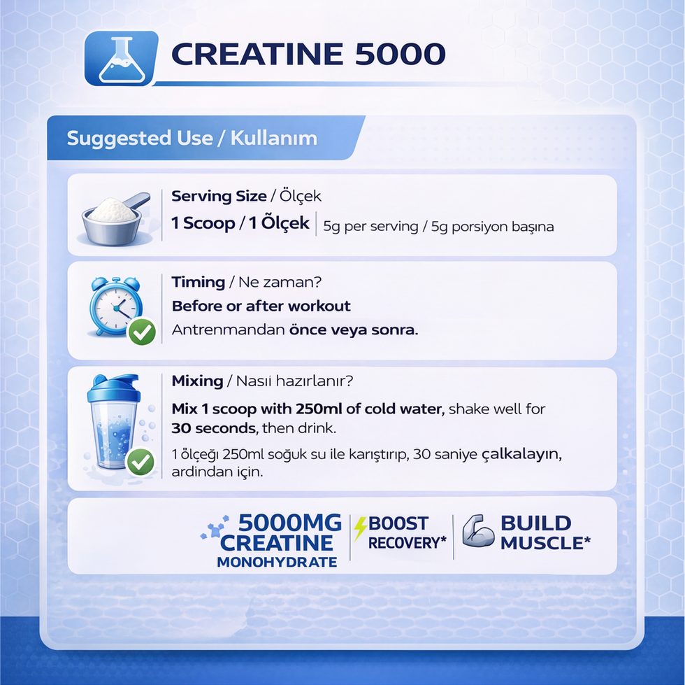 Tavsiye edilen günlük porsiyon 1 tam ölçektir (5 gram / 5000 mg Kreatin Monohidrat). Ürün su, meyve suyu, protein shake veya tercih edilen sporcu içeceği ile karıştırılarak tüketilebilir.